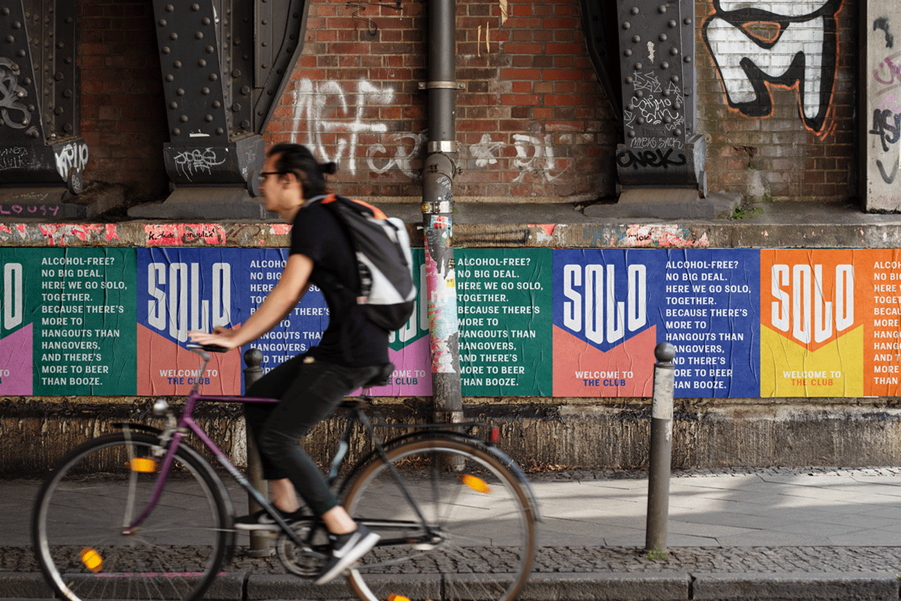 Solo無酒精啤酒包裝,三個關鍵詞運動感,下箭頭,對比色。抓住了人們心智厭惡混亂的特點,簡潔明了的描述了產品賣點無酒精淡啤,通過向下的箭頭不斷暗示消費者酒精度數已經下降到零,對比色區分信息,增強識別性。